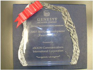 在2006年8月結(jié)束的澳洲墨爾本G-Force會議上,Genesys將 “2005年亞太地區(qū)最佳市場拓展”(2005 Market Development Award,APAC)獎項(xiàng)授予億迅,億迅總裁李冰影女士出席頒獎儀式并代表公司領(lǐng)取該獎。