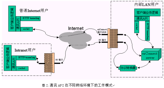 對于被企業(yè)防火墻所限制的Intranet用戶,情況略微復雜一些。如果企業(yè)防火墻已開放ezConnect的協(xié)議端口2624,那么此類Intranet用戶訪問ezConnect系統(tǒng)的情況與普通Internet用戶沒有區(qū)別。如果企業(yè)防火墻限制ezConnect的協(xié)議端口,但允許HTTP協(xié)議通過,那么上文中提到的API會自動選用HTTP隧道的通信方式來維護客戶端軟件與服務器軟件之間的連接。此時,通信的效率會相對低一些,但對于可以透明地、完整地獲取Internet呼叫中心服務(文本交談、白板共享、IP電話等)的Intranet用戶來講是完全可以接受的。如果企業(yè)防火墻同時禁止ezConnect的協(xié)議端口2624和HTTP協(xié)議的默認端口80,Intranet用戶將無法訪問ezConnect系統(tǒng)。而事實上,嚴格到不允許HTTP協(xié)議通過的防火墻是非常少見的,因此目標4也不成為問題。