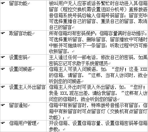 3). 管理員可完成的功能有:①開啟信箱,②關(guān)閉信箱,③修改用戶密碼,④修改管理員密碼,⑤錄制電腦話務(wù)員提示語,⑥設(shè)定系統(tǒng)時(shí)間,⑦查號(hào)臺(tái)錄音