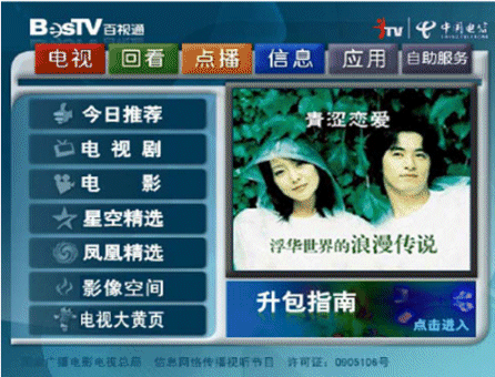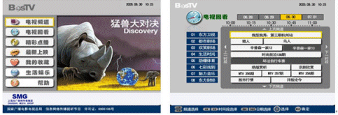 上海IPTV業(yè)務(wù)自2006年9月1日放號(hào)以來,發(fā)展十分迅速。截止10月7日,上海電信IPTV業(yè)務(wù)共計(jì)發(fā)展用戶達(dá)2.2萬。如下是上海IPTV商用系統(tǒng)EPG頁(yè)面: