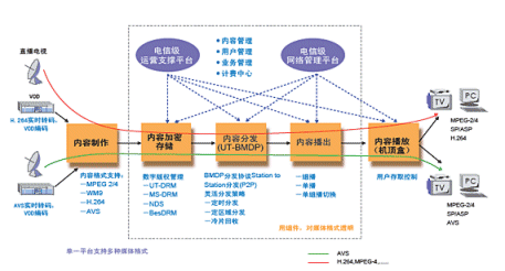 - 完整的解決方案,從內(nèi)容編碼、轉(zhuǎn)碼、分發(fā)、計(jì)費(fèi)、用戶管理、EPG、NMS、媒體資產(chǎn)管理、運(yùn)營(yíng)支撐系統(tǒng)、安全性、DRM及機(jī)頂盒等;