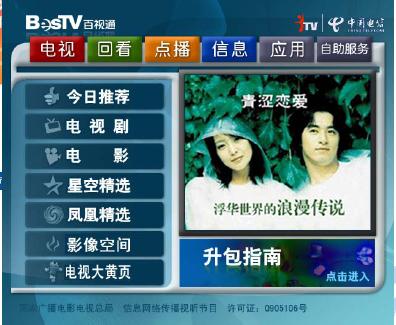 上海IPTV點(diǎn)播節(jié)目達(dá)3000小時(shí),包括電影、電視劇、音樂娛樂、紀(jì)實(shí)節(jié)目、少兒、體育以及教育等欄目。點(diǎn)播節(jié)目改變了“你播我看”的電視被動(dòng)接受方式,讓用戶可以根據(jù)自己的喜好來選擇喜愛的個(gè)性化節(jié)目,大大提高了用戶的喜愛度。值得一提的是,當(dāng)收看電影中途退出的時(shí)候,系統(tǒng)提供了“書簽”功能,下一次收看時(shí),便可以從書簽處繼續(xù),方便用戶使用和體驗(yàn)。另外,系統(tǒng)提供的“搜索”功能也讓百姓眼前一亮,尋找自己喜愛的影片就更方便了。