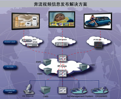 UT斯達康緊跟市場發(fā)展趨勢和運營商步伐,深入研究戶外液晶廣告業(yè)務的發(fā)展、大力推進廣告平臺的研發(fā)。2006年,UT斯達康推出了奔流(RollingStream)視頻信息發(fā)布解決方案(如圖2所示)。奔流視頻信息發(fā)布解決方案是以奔流(RollingStream)IPTV平臺為基礎,結(jié)合戶外液晶廣告市場需求,融合運營商以視頻為主的綜合信息發(fā)布的需求,真正運營級的電信級解決方案。該方案可以幫助運營商實現(xiàn)融合信息服務和廣告業(yè)務的統(tǒng)一運營,幫助運營商開展兼具公益性和盈利性的信息發(fā)布業(yè)務,運營商在推進社會信息化、造福公眾的同時,通過視頻廣告的運營,也能獲取盈利。該方案基于電信級平臺的穩(wěn)定性、安全性、擴展性設計要求,可支持百萬級大規(guī)模部署能力,可提供電信級質(zhì)量保證的服務;該方案基于IP流媒體技術,可通過IP網(wǎng)絡實時、精準、互動地投放廣告內(nèi)容,從而可以支持豐富、新穎的廣告運營模式;該方案基于數(shù)字多媒體技術,除了可以發(fā)布視頻廣告,還可以發(fā)布圖片、文字、消息等廣告內(nèi)容。