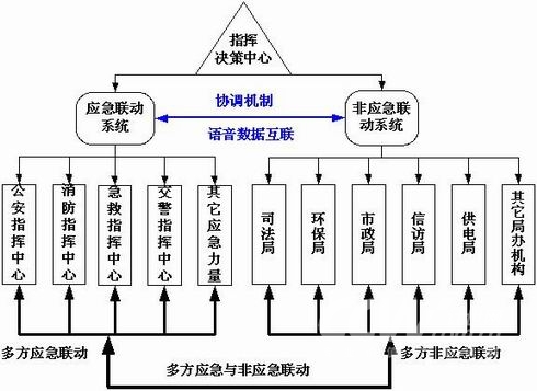 所謂“應(yīng)急與非應(yīng)急一體化聯(lián)動”,就是在應(yīng)急聯(lián)動和非應(yīng)急聯(lián)動的基礎(chǔ)上,通過先進(jìn)的技術(shù)手段實(shí)現(xiàn)應(yīng)急聯(lián)動系統(tǒng)與非應(yīng)急聯(lián)動系統(tǒng)的高度整合,無縫聯(lián)接,并通過相應(yīng)的協(xié)調(diào)機(jī)制,實(shí)現(xiàn)各種應(yīng)急處置力量和非應(yīng)急處理部門的一體化的協(xié)同與聯(lián)動,以共同應(yīng)對和協(xié)調(diào)解決各種尤其是涉及多個方面的緊急或非緊急的事件和問題。