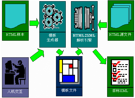HTML2XML1.0中包括了兩個工具:HTML2XML模板生成器和HTML2XML解析引擎。通過該HTML2XML模板生成器的GUI界面和HTML2XML解析引擎,將HTML文件中的<Table>標(biāo)記中的數(shù)據(jù),根據(jù)指導(dǎo)性文件,轉(zhuǎn)換成XML格式數(shù)據(jù),供其他應(yīng)用程序進(jìn)行進(jìn)一步處理。
