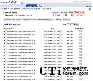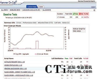 只需使用一個(gè)簡(jiǎn)單易用的Web接入就可以和Empirix測(cè)試小組一起實(shí)時(shí)跟蹤測(cè)試進(jìn)度。此外,還同時(shí)可以查看測(cè)試結(jié)果、發(fā)生失敗的類型和導(dǎo)致失敗發(fā)生的測(cè)試流量。通話全程記錄功能可以用來記錄相關(guān)通話,從而捕獲和幫助診斷發(fā)生失敗的根源?梢詤⒖枷铝袌D表:
