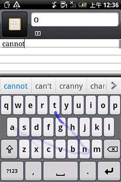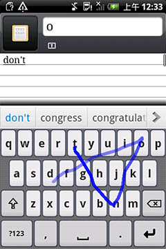 如圖所示,Nuance T9 Trace英文輸入方案對(duì)于各種不同的字母組合都能有效識(shí)別,像“google”這種既有連續(xù)又有間斷重復(fù)字母的單詞也不在話(huà)下,一次就能精準(zhǔn)輸出。另外,該輸入法還可以省去標(biāo)點(diǎn)符號(hào),如“don"t”“can"t”等單詞,用戶(hù)只需滑觸“d-o-n-t”這四個(gè)字母,輸入法就會(huì)自動(dòng)識(shí)別。