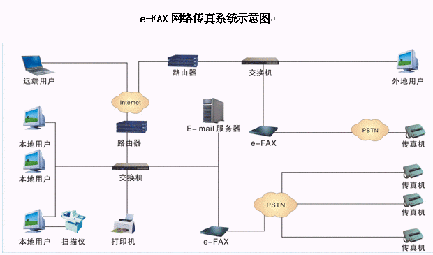 e-FAX網(wǎng)絡(luò)傳真機(jī) 的工作原理是利用內(nèi)部設(shè)備對(duì)傳真和語音信號(hào)的存儲(chǔ)及轉(zhuǎn)換功能,在網(wǎng)絡(luò)配置許可的范圍內(nèi) , 主要實(shí)現(xiàn)了自動(dòng)接收和發(fā)送傳真的功能。系統(tǒng)內(nèi)用戶能通過電子郵件和網(wǎng)頁方式收取自己的傳真或語音,發(fā)送傳真時(shí)只需要提交傳真給傳真服務(wù)器,服務(wù)器能自動(dòng)發(fā)送。系統(tǒng)外用戶能在語音流程的提示下發(fā)送或接收傳真,也可以選擇發(fā)送留言信息。系統(tǒng)管理員則可以對(duì)系統(tǒng)進(jìn)行參數(shù)配置,流程定制和用戶信息管理等功能操作。