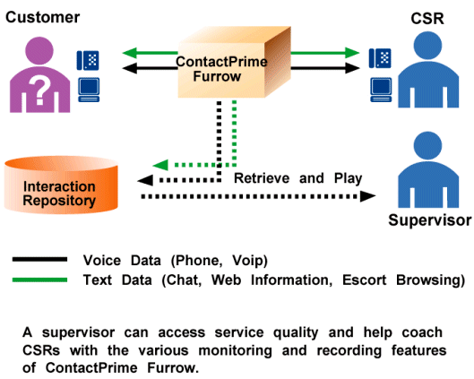 ContactPrime Furrow提供的完全記錄解決方案可以協(xié)助進行訓練、性能評估、交易驗證與爭議解決等工作。不僅記錄語音呼叫,而且對于聊天、陪同瀏覽和Web互操作等文本行為也可記錄。