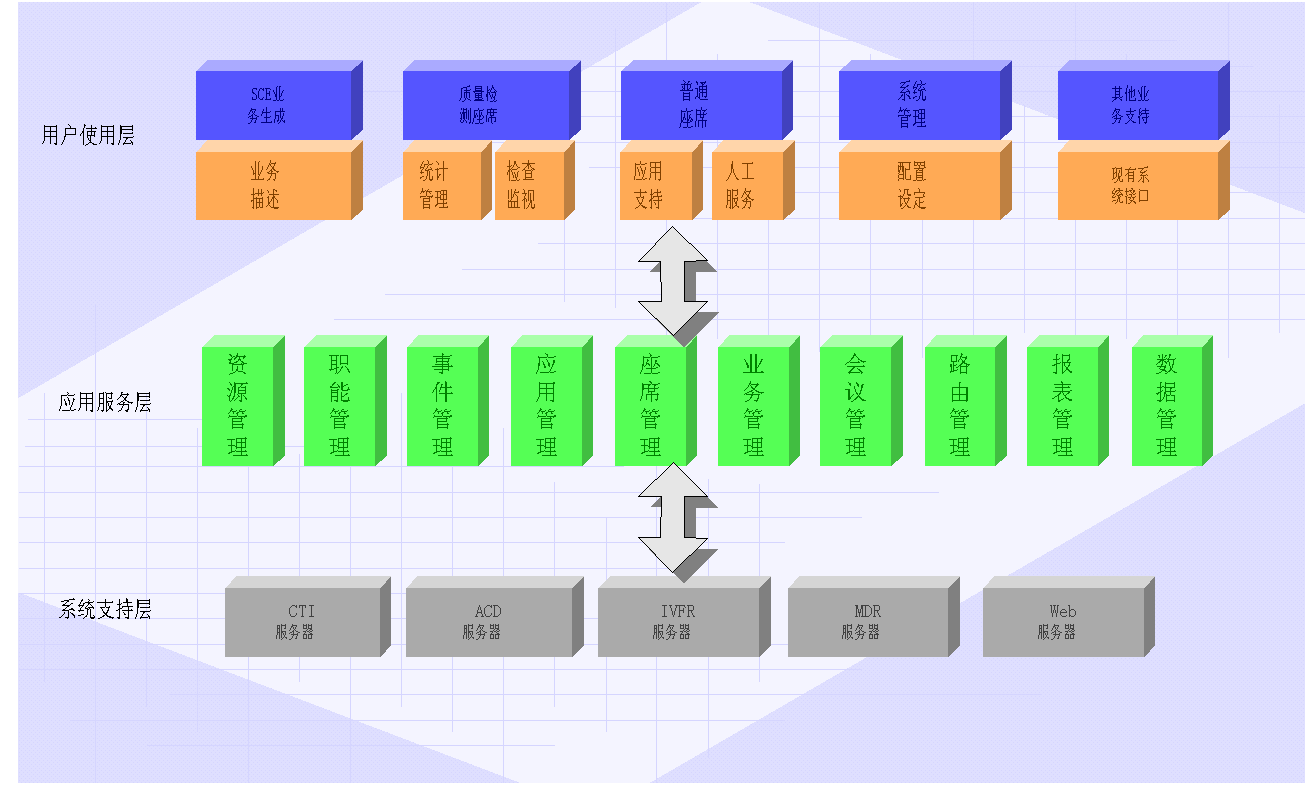 采用功能分散,統(tǒng)一管理的設(shè)計(jì)模式。各組件功能相對(duì)獨(dú)立,分布式處理各項(xiàng)事務(wù),它們的有機(jī)結(jié)合實(shí)現(xiàn)了功能完善的ACD服務(wù)器。各組件的預(yù)留接口提供了功能擴(kuò)充的有效途徑。功能包括: