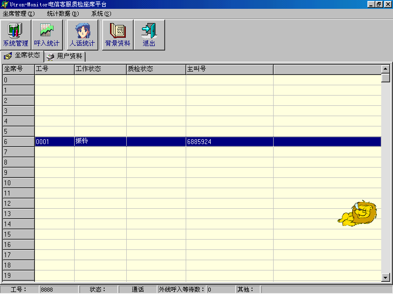 。。座席應(yīng)答時(shí),在當(dāng)前座席座席端上顯示系統(tǒng)分配的客戶隊(duì)列和在線的客戶信息。同時(shí),通過(guò)客戶管理功能,還可以對(duì)系統(tǒng)存儲(chǔ)的客戶信息進(jìn)行維護(hù)和管理。
