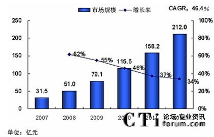 再來(lái)看看統(tǒng)一市場(chǎng)的前景,下圖是某咨詢公司對(duì)國(guó)內(nèi)統(tǒng)一通信市場(chǎng)的預(yù)測(cè)數(shù)據(jù),2012年將達(dá)到212億元,盡管可能存在一定水份,但這么多公司介入這個(gè)市場(chǎng),本身就體現(xiàn)了發(fā)展?jié)摿Γ@點(diǎn)不容懷疑。