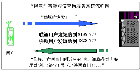 2004年4月15日和4月20日,擁有完全自主知識(shí)產(chǎn)權(quán)的語音與語言技術(shù)開發(fā)商和技術(shù)提供商北京得意音通技術(shù)有限責(zé)任公司(得意公司),在國(guó)際上率先把中文自然語言理解技術(shù)應(yīng)用在中國(guó)聯(lián)通和中國(guó)移動(dòng)短信服務(wù)平臺(tái)上,結(jié)合《精品購(gòu)物指南》報(bào)社權(quán)威、全面的信息資源,開通了北京地區(qū)餐飲領(lǐng)域智能短信查詢服務(wù)(簡(jiǎn)稱智能短信),并將進(jìn)一步支持互聯(lián)網(wǎng)平臺(tái)和WAP平臺(tái),陸續(xù)開通更豐富和更實(shí)用的智能信息服務(wù)。