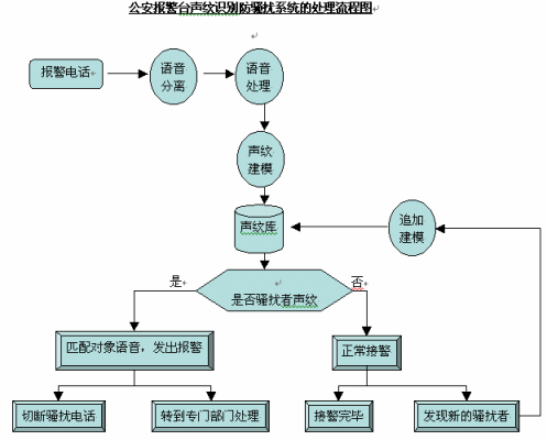 公安報(bào)警臺聲紋識別防騷擾系統(tǒng)的處理流程為: