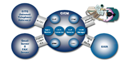 CICM是ITI解決方案中的核心模塊,該模塊完成系統(tǒng)涉及到互聯(lián)網(wǎng)的所有通話的控制,包括VOIP、E-mail、Chatting、畫像通話等。而該模塊與CICR的連動(dòng)正是完成CTI和ITI技術(shù)完美結(jié)合的關(guān)鍵。即當(dāng)一個(gè)網(wǎng)上呼叫呼入時(shí),由CICR返回所分配的話務(wù)員相關(guān)信息(如:IP),然后CICM將該信息送給客戶使得網(wǎng)絡(luò)聊天和WEB到電話的通話得以同步。而CCPM