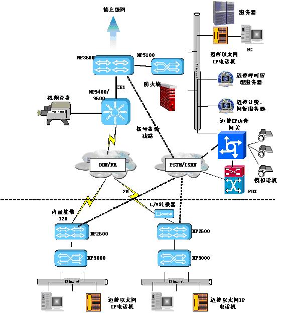 目前許多公安系統(tǒng)雖然采用具有IP語音功能的路由設(shè)備組建網(wǎng)絡(luò),但在業(yè)務(wù)語音交流通常還通過PBX集團(tuán)交換機(jī)走電信PSTN/ISDN電話網(wǎng),這樣無法節(jié)省電話費(fèi)用,反而增加了辦公費(fèi)用。邁普IP語音解決方案采用了邁普MyPower VG2000IP語音網(wǎng)關(guān)和邁普以太網(wǎng)IP電話進(jìn)行改造。在整個(gè)網(wǎng)點(diǎn)語音終端全部設(shè)備選用經(jīng)濟(jì)型邁普以太網(wǎng)IP電話機(jī),它采用雙以太口設(shè)計(jì),使網(wǎng)絡(luò)無需重新布線,同時(shí)也可使用已有的路由器上IP語音模塊;邁普以太網(wǎng)IP電話機(jī)之間的話音通信通過邁普呼叫管理服務(wù)器集中控制。在主體IP網(wǎng)絡(luò)中,邁普IP語音網(wǎng)關(guān)放置于中心機(jī)房作為傳統(tǒng)PSTN的出口,可以通過VOS接口、E1接口(中國(guó)一號(hào)信令)、E&M接口等多種方式接入公安PBX,將PSTN線路傳來的時(shí)分話音或傳真信息進(jìn)行分組和壓縮,轉(zhuǎn)換成IP數(shù)據(jù)包,通過路由設(shè)備路由到目的地;在沒有PBX的公安機(jī)房,邁普IP語音網(wǎng)關(guān)可以提供32路的模擬用戶接口,可以完全替代傳統(tǒng)PBX并接入PSTN,并提供額外功能,如圖中虛線所示;整個(gè)方案還可以針對(duì)公安用戶特殊需求"定做"特色功能,例如緊急告警等方便日常辦公。