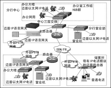 分行中心與下面的支行以及各儲(chǔ)蓄網(wǎng)點(diǎn)根據(jù)業(yè)務(wù)應(yīng)用需求出發(fā),可以利用邁普各系列路由器產(chǎn)品,通過DDN或者幀中繼把分行辦公大樓和營(yíng)業(yè)部、支行辦公大樓和營(yíng)業(yè)部、分行和支行下屬儲(chǔ)蓄所連起來。對(duì)于分行中心以及下面的支行,由于網(wǎng)絡(luò)結(jié)構(gòu)比較復(fù)雜,再加上網(wǎng)絡(luò)基礎(chǔ)設(shè)施建設(shè)已經(jīng)很完善,一般可以采用邁普IP語音網(wǎng)關(guān),通過它與原有的外部PSTN網(wǎng)絡(luò)相連。而對(duì)于一些較小的儲(chǔ)蓄網(wǎng)點(diǎn),則可以通過采用帶有IP電話模塊的邁普路由器。邁普路由器的IP電話模塊可與電話機(jī)或交換機(jī)相連,能夠支持G.711、G.723、G.729等多種語音壓縮算法,并且還支持H.323協(xié)議,實(shí)現(xiàn)IP電話功能。