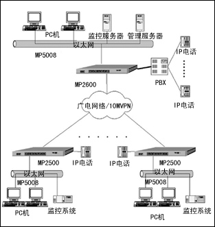 各分店用一臺MP2500路由器,配雙以太口,一個(gè)口接MP5008交換機(jī)組建本地以太網(wǎng),一個(gè)口接廣電的10MVPN,以實(shí)現(xiàn)本地以太網(wǎng)與總店、各分店、配送中心等連接。配1個(gè)RM2-1VoIP單路IP電話模塊,直接下掛普通電話機(jī),以實(shí)現(xiàn)全網(wǎng)IP電話免費(fèi),同時(shí)還可以通過總店的程控交換機(jī)與市話連接。分店以太網(wǎng)中,掛有監(jiān)控系統(tǒng)、PC機(jī)、醫(yī)保讀卡器等。模塊化設(shè)計(jì)提供了網(wǎng)絡(luò)擴(kuò)展的空間,滿足未來業(yè)務(wù)的發(fā)展。邁普的路由器提供多種模塊,用戶可以根據(jù)實(shí)際需要加裝不同的模塊,滿足不同環(huán)境的使用要求。模塊化設(shè)計(jì)可以極大地方便設(shè)備的維護(hù),并為今后的網(wǎng)絡(luò)升級改造提供足夠的預(yù)留空間。