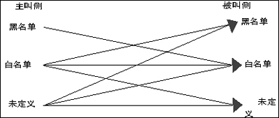 主/被叫黑白名單是號(hào)碼防火墻的一種簡(jiǎn)易實(shí)現(xiàn)方式。黑白名單能夠在有限分類的情況下,提供相對(duì)豐富的權(quán)限控制能力。具體說(shuō),黑白名單就是把電話號(hào)碼分為三類,并定義這些分類之間的呼叫限制。(如圖2)