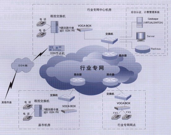 中心并設立一級計費認證及結算中心、網絡管理中心(VBMS),對網內電話集中管理和計費。通過在各地市機構原有的內部網絡基礎上增加數臺VOCABOX實現語音終端接入,并在地市機構通過帶FXO接口的VOCABOX實現內部IP電話與內部電話網絡的呼叫轉接,網絡拓撲連接如下圖所示