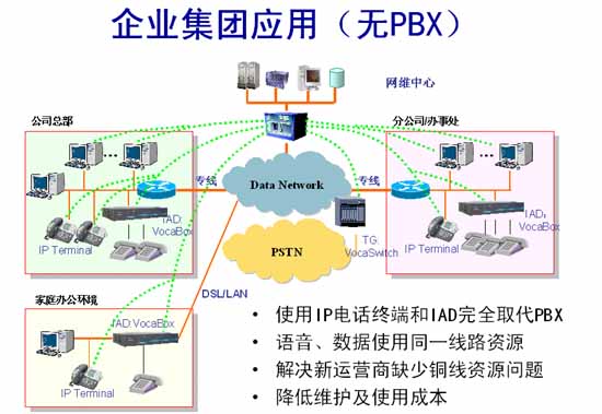 - 專網用戶通過VOIP,可組成一個大的IP PBX系統(tǒng),使圖像、數據、語音通過統(tǒng)一網絡傳送,做到三網合一,有效利用資源,提高效率;