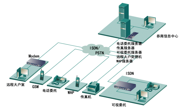 券商證券委托一般包括:電話傳真委托、可視委托(又稱遠(yuǎn)程大戶室)和網(wǎng)上委托等。其中除網(wǎng)上委托可通過Internet網(wǎng)外,其它委托必須通過PSTN網(wǎng)來連接。在當(dāng)前階段,此類委托占有最大的客戶群。以前,每個券商為了實(shí)現(xiàn)此類委 托,必須在券商中心的機(jī)器上安裝語音卡、傳真卡、座席卡來滿足電話傳真委托,另外還必須在另外一臺機(jī)器上安裝多串口卡和Modem Pool與座席卡相連來滿足可視委托,遠(yuǎn)程大戶室等業(yè)務(wù)。此方案,用戶不僅需要購買很多卡,占用很多機(jī)器插槽,而且在實(shí)現(xiàn)可視委托時,只能接受客戶端PSTN模擬Modem的呼叫,而不能接收目前ISDN的連接方式,速度非常緩慢。本文主要提出了一種采用Eicon Diva Server PRI卡的新型解決方案,本方案不僅省去了在中心插上傳真卡、語音卡、座席卡多種卡,又省去了多串口卡和Modem Pool構(gòu)件,只需在中心的一臺機(jī)器插上1-4塊Diva Server PRI卡后,便能滿足你電話傳真委托、可視委托 、遠(yuǎn)程大戶室等多種業(yè)務(wù),還支持WAP呼叫,SMS短消息發(fā)送等,在可視委托和遠(yuǎn)程大戶室業(yè)務(wù)中,不僅支持PSTN Modem的模擬呼叫,也支持ISDN的數(shù)字呼叫,方案的性價比極高,方案連接圖如下圖所示: