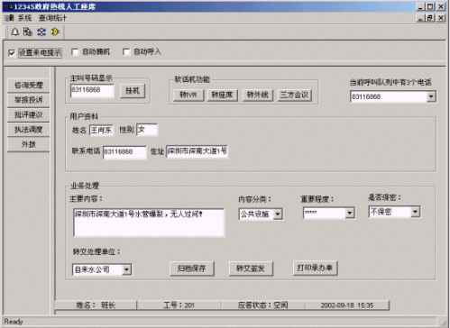 系統(tǒng)提供強大的信息資料處理功能,座席可記錄舉報、投訴、批評、建議等記錄單,將信息資料歸檔保存、打印受理單或將受理單等文件轉交簽發(fā)相關政府職能部門;系統(tǒng)引入CRM(Customer