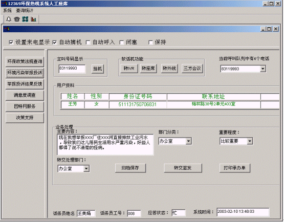 該系統(tǒng)利用環(huán)保局現(xiàn)有的信息網(wǎng)絡(luò)資源,將自動語音查詢、人工服務(wù)、信息資料處理緊密結(jié)合起來,為人民群眾提供全天候24小時(shí)不間斷的優(yōu)質(zhì)服務(wù)。