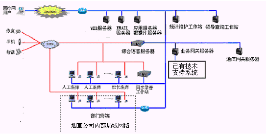 煙草公司呼叫中心將接入功能、導(dǎo)航功能、自動(dòng)語音查詢功能、人工座席服務(wù)功能、話路轉(zhuǎn)接功能、信息資料處理緊密聯(lián)系起來。用戶撥打特服電話號(hào)碼后,可以根據(jù)需要選擇人工服務(wù)、自動(dòng)語音查詢、自動(dòng)留言,并能夠在幾種服務(wù)中來回切換或轉(zhuǎn)接其它電話;所記錄的資料可以分門別類的進(jìn)行統(tǒng)計(jì)并形成報(bào)表,供相關(guān)部門進(jìn)行檢索查閱;意見處理完畢,可由座席主動(dòng)呼叫用戶,告知處理意見,形成閉環(huán)處理流程。