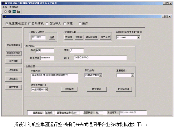 航空集團運行控制部門分布式通訊平臺將接入功能、導航功能、自動語音查詢功能、人工座席服務(wù)功能、話路轉(zhuǎn)接功能、信息資料處理緊密聯(lián)系起來。本地或異地有關(guān)部門/工作人員撥打特服電話號碼后,可以根據(jù)需要選擇人工服務(wù)、自動語音查詢、自動留言,并能夠在幾種服務(wù)中來回切換或轉(zhuǎn)接其它電話,也可以路由到遠程座席;所記錄的資料可以分門別類的進行統(tǒng)計并形成報表,供相關(guān)部門進行檢索查閱;意見處理完畢,可由人工座席主動呼叫本地或異地有關(guān)部門/工作人員,告知處理意見,形成閉環(huán)處理流程;可定期進行信息歸納、推演、預(yù)測等,從而得到信息深加工品。