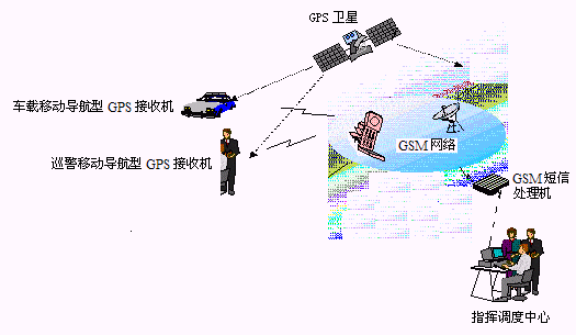 巡警利用移動(dòng)終端(帶手機(jī)通信功能的GPS接收機(jī))發(fā)出報(bào)警信號,通過GSM系統(tǒng)送到指揮調(diào)度中心。
