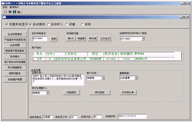 (2)提高家電企業(yè)親切感:系統(tǒng)在人工服務(wù)狀態(tài)下,當(dāng)業(yè)務(wù)代表輸入客戶(hù)名稱(chēng)時(shí),系統(tǒng)即時(shí)將客戶(hù)與家電企業(yè)相關(guān)的信息顯示在座席終端上,使業(yè)務(wù)及時(shí)了解客戶(hù),有針對(duì)性回答客戶(hù)問(wèn)題,使客戶(hù)倍感親切。