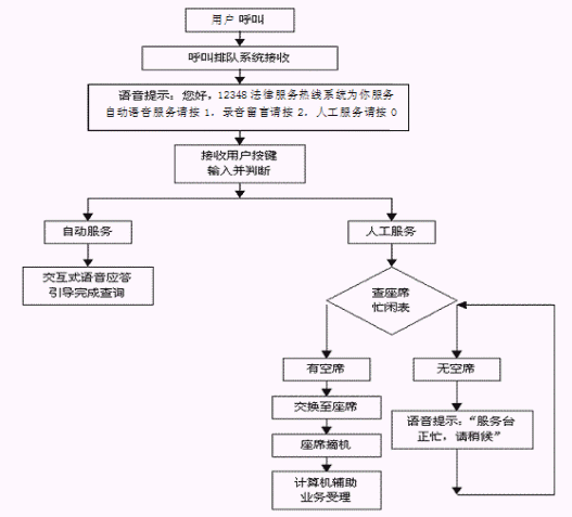 本系統(tǒng)將需轉入人工服務的用戶(電話)語音線路,根據(jù)一定的分配算法,將人民群眾打入的電話合理地分配給后臺的座席操作人員進行處理,使系統(tǒng)的工作得以合理的分配。
