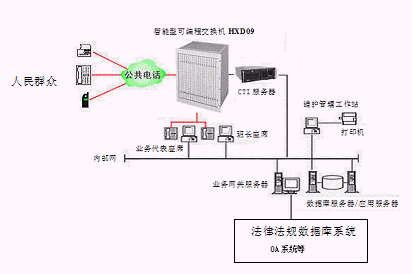 該系統(tǒng)的設計采用先進的三層CLIENT/SERVER網(wǎng)絡體系結構,集目前先進的計算機技術、通信技術、計算機電信集成(CTI)技術、多媒體呼叫接入技術、智能接入交換分配技術、數(shù)字語音處理技術、異構系統(tǒng)信息交互技術、INTERNET網(wǎng)絡技術、安全容錯技術、網(wǎng)絡組網(wǎng)技術等于一體,并與地級市司法行政部門/法院已有技術支持系統(tǒng)(如MIS系統(tǒng)、法律法規(guī)數(shù)據(jù)庫系統(tǒng)等)緊密結合在一起,突破時空的限制,通過人工座席、自動語音/傳真、司法部門相關人員等為群眾提供電話、傳真、手機等多種服務形式的周到、快捷、全方位的法律服務,為人民群眾與地級市司法行政部門/法院之間架起一座密切聯(lián)系的橋梁。
