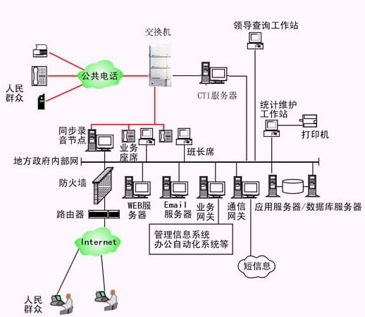省局推薦采用排隊(duì)交換機(jī)(如AVAYA DEFINITY ECS等)作為接入設(shè)備,市局推薦采用智能可編程交換機(jī)(如HXD09等)作為接入設(shè)備;縣局建議采用語(yǔ)音板卡方式。
