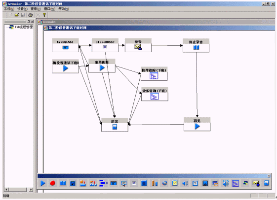 系統(tǒng)提供圖形化的語音流程生成環(huán)境,以方便用戶對語音流層進行定制。流程生成器是一套可視化的流程設(shè)計工具,通過拖拉圖標控件、鼠標連線即實現(xiàn)呼叫中心CTI流程的制作,同時,通過運行時鏈接動態(tài)連接庫(DLL),實現(xiàn)對業(yè)務數(shù)據(jù)庫的訪問;通過運行時鏈接用戶DLL,最靈活地與用戶應用系統(tǒng)結(jié)合;支持多種業(yè)務集成和動態(tài)流程控制,方便用戶拓展業(yè)務;采用事件驅(qū)動機制、開放的結(jié)構(gòu),滿足各種語音系統(tǒng)的需要;支持不限個數(shù)、級數(shù)的IVR結(jié)構(gòu),可滿足用戶非常復雜的需求。