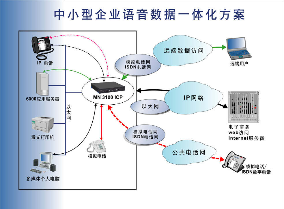 商務(wù)電話系統(tǒng)、本地網(wǎng)和網(wǎng)關(guān)集成在統(tǒng)一的平臺(tái)上?敏迪網(wǎng)絡(luò)推出的MN3100綜合通信平臺(tái)就是這樣簡(jiǎn)單快捷的滿足您的需要,它是專為小型企業(yè)或大型企業(yè)的分支機(jī)構(gòu)而設(shè)計(jì)的語(yǔ)音數(shù)據(jù)集成的解決方案。