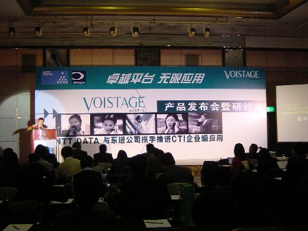 2004年2月19日,NTT DATA(中國)有限公司在北京長富宮飯店舉行了主題為"卓越平臺,無限應(yīng)用"的VOISTAGE產(chǎn)品發(fā)布及應(yīng)用研討會,在會上發(fā)布了CTI產(chǎn)品VOISTAGE。來自日本NTT DATA總公司的高層在會上發(fā)表主題演講時表示,NTT DATA將與戰(zhàn)略合作伙伴東進(jìn)公司攜手共同大力推進(jìn)VOISTAGE產(chǎn)品在中國中小企業(yè)級市場中的應(yīng)用。