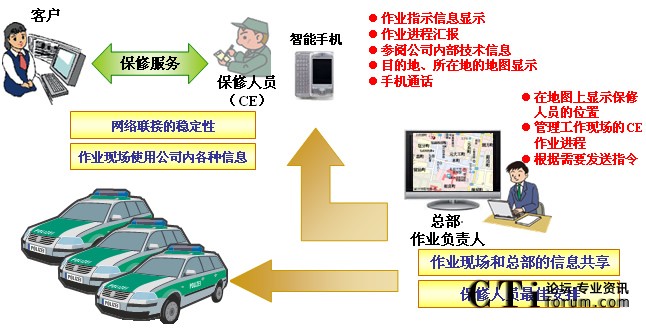 “MoBiz AP for CE支持系統(tǒng)”是在支持保修人員在工作現(xiàn)場作業(yè)的同時(shí),實(shí)現(xiàn)總部對(duì)工作現(xiàn)場“可視化”管理的應(yīng)用程序軟件包。