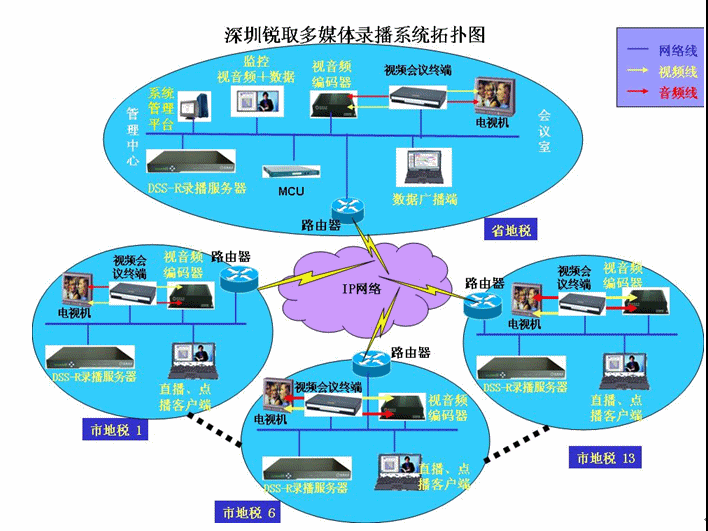 黑龍江省地稅采用了華為產(chǎn)品搭建了視頻會(huì)議系統(tǒng),實(shí)現(xiàn)了黑龍江省地稅和13個(gè)地市的電視電話(huà)會(huì)議功能,能夠?qū)崿F(xiàn)13個(gè)地市和省地稅之間的圖像、語(yǔ)音和數(shù)據(jù)的交互通訊,在此基礎(chǔ)上配置了銳取14臺(tái)DSS-R-C100多媒體錄播系統(tǒng)(省地稅與各市地稅各1臺(tái)),該系統(tǒng)可以輔助視頻會(huì)議系統(tǒng)完成視頻會(huì)議的錄制、直播和點(diǎn)播功能,錄制、直播和點(diǎn)播的內(nèi)容包括了主會(huì)場(chǎng)圖像、分會(huì)場(chǎng)圖像以及聲音和數(shù)據(jù)信號(hào)。