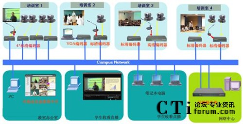 在南洋理工的商學(xué)院中有一個培訓(xùn)中心,培訓(xùn)中心中有4個培訓(xùn)課室。 商學(xué)院的老師們希望可以把這4培訓(xùn)課室中的培訓(xùn)課程錄制下來,并可以同時直播到其它教室。老師可以監(jiān)控這4個培訓(xùn)課室的培訓(xùn)情況。學(xué)生可以使用PC通過校園網(wǎng)收看到實時的培訓(xùn)情況,及培訓(xùn)后的回放他們可能錯過了的培訓(xùn)。系統(tǒng)可與NTU現(xiàn)有的E_learning系統(tǒng)無縫融合,為為豐富E_learning的課件資源提供低成本、高效率的制作手段。同時系統(tǒng)應(yīng)該便于維護及用戶界面友好,而且便于以后的擴容。因培訓(xùn)室的功能差異,每一間培訓(xùn)室內(nèi)所需記錄的信號類型及數(shù)量均不相同,要求系統(tǒng)能夠進行匹配和適應(yīng)。