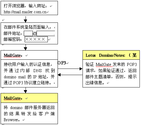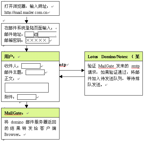 金笛郵件網(wǎng)關(guān)完全基于B/S架構(gòu)的設(shè)計(jì),使得郵件收發(fā)、管理都是基于瀏覽器完成,客戶端只要打開IE瀏覽器即可,無需做任何設(shè)置,大大方便了用戶。也就是說,在城域網(wǎng)任一節(jié)點(diǎn),都可以通過內(nèi)部域名(DNS)訪問郵件網(wǎng)關(guān),然后通過郵件網(wǎng)關(guān)與用戶所在的domino郵件服務(wù)器通訊,將郵件主題、郵件內(nèi)容顯示在web頁面上。金笛?郵件網(wǎng)關(guān)的具體工作流程如下: