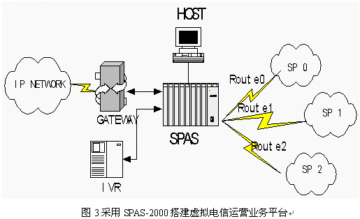 中國加入WTO后,國內(nèi)與國際的聯(lián)系、交流和溝通將會越來越頻繁,這一趨勢帶來了巨大的電信服務(wù)市場商機(jī)。同時(shí),國際電信企業(yè)正在尋求進(jìn)入中國的途徑,國內(nèi)新興的電信運(yùn)營商積極應(yīng)對這種局面,而虛擬電信運(yùn)營商也在國內(nèi)開始出現(xiàn)。如何爭取客戶是所有這些提供電信服務(wù)的企業(yè)共同面臨的課題。一個(gè)智能化的、高效的、靈活的、有特點(diǎn)并易于控制的服務(wù)平臺無疑是他們進(jìn)行競爭的重要工具。由于SPAS-2000可編程交換機(jī)是一個(gè)全開放的靈活平臺,用戶通過應(yīng)用程序幾乎可以完全控制交換,能很好的滿足用戶的需求。在此SPAS-2000可編程交換機(jī)上開發(fā)的電話批發(fā)及零售業(yè)務(wù)應(yīng)用,配合計(jì)算機(jī)技術(shù),能靈活控制業(yè)務(wù)的路由選擇、費(fèi)率計(jì)算并可提供個(gè)性化服務(wù),為運(yùn)營商降低運(yùn)營成本,提高服務(wù)質(zhì)量給出了有效的解決方案。例如一個(gè)IP電話運(yùn)營商在全球互連中可能有多個(gè)合作伙伴,每個(gè)合作伙伴提供的服務(wù)也不相同,為了節(jié)省費(fèi)用并提高服務(wù)質(zhì)量,IP電話運(yùn)營商需要根據(jù)時(shí)段、費(fèi)率、通話質(zhì)量、接通率等指標(biāo)智能選擇去話路徑。SPAS-2000可編程交換機(jī)提供編程開發(fā)接口,通過E1與IVR連接,在服務(wù)器上開發(fā)高層應(yīng)用軟件,可以實(shí)現(xiàn)多種高級功能。同時(shí)SPAS還可以連接各種型號的網(wǎng)關(guān)。應(yīng)用連接圖見圖3: