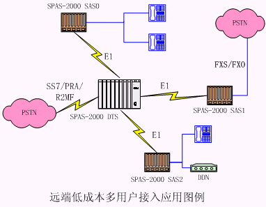 tyutSPAS-2000可編程交換機(jī)通過(guò)E1可以支持多個(gè)遠(yuǎn)端模塊。遠(yuǎn)端模塊采用SPAS-2000 SAS框,可以帶多種用戶接口:普通模擬用戶、DDN、環(huán)路中繼用戶;通過(guò)SPAS-2000 DTS對(duì)外提供各種信令接入。適合多點(diǎn)接入組網(wǎng),組網(wǎng)成本低廉。 在示意圖中,SAS表示遠(yuǎn)端用戶接入框,它可以通過(guò)需要選擇接入模擬用戶:FXO/FXS、E/M、普通模擬用戶和DDN。中心為SPAS可編程交換機(jī),可以通過(guò) SS7/PRA/R2MF進(jìn)行匯接轉(zhuǎn)換。