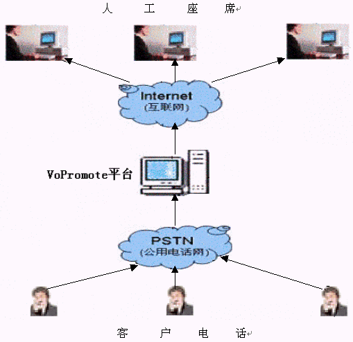 傳統(tǒng)方式為呼叫方撥通電話后直接進入電信網(wǎng)絡(luò)以模擬信號的傳播與被叫方通話。VoPromote語音平臺的VOIP解決方案為:外呼電話接入VoPromote語音平臺,通過VoPromote語音平臺的解析后模擬信號轉(zhuǎn)換為數(shù)字信號以Internet網(wǎng)為媒介進行語音數(shù)據(jù)的傳輸。接收方只需在接入Internet網(wǎng)的計算機上安裝聲卡即可通過主機的聲音輸入/出接口來實現(xiàn)與對方的通話。從而利用網(wǎng)互聯(lián)網(wǎng)打一通"免費電話"。