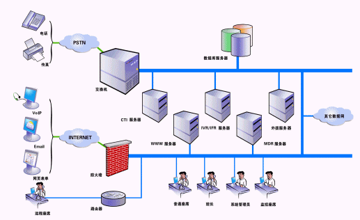 SmartCon呼叫中心由數(shù)字程控交換機(或中繼板卡)、計算機電話集成服務器(SmartCTI)、交互式語音/傳真應答服務器(SmartIVR/IFR)、多通道數(shù)字錄音服務器(SmartMDR)、自動呼叫分配服務器(SmartACD)、地理信息系統(tǒng)服務器(SmartGIS)、Email服務器、座席終端系統(tǒng)(SmartAgent)、業(yè)務統(tǒng)計管理子系統(tǒng)、系統(tǒng)安全管理子系統(tǒng)、數(shù)據(jù)庫服務器等組成,其中交換機又可作為本單位內部電話交換機使用。系統(tǒng)的網絡結構示意圖如下: