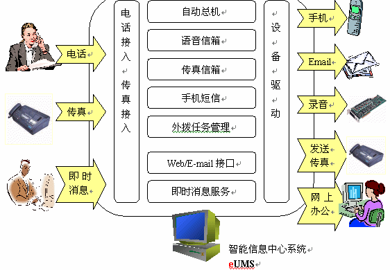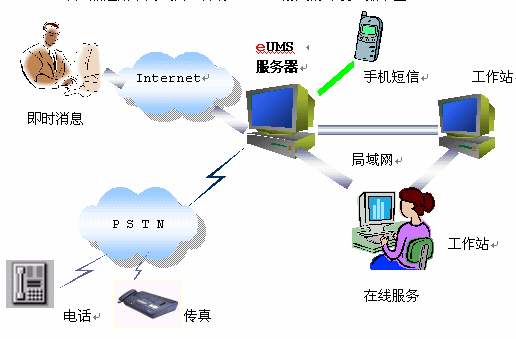 整個(gè)系統(tǒng)以eUMS服務(wù)器為核心,對(duì)內(nèi)連接企業(yè)局域網(wǎng),對(duì)外連接互聯(lián)網(wǎng)。eUMS內(nèi)配置一塊語(yǔ)音/傳真卡,負(fù)責(zé)電話(huà)、傳真的接入。如果企業(yè)需要自己的短信服務(wù),也可以在eUMS服務(wù)器上安裝手機(jī)短信網(wǎng)關(guān),外接一部手機(jī)即可。