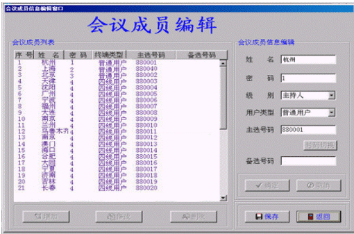 ·成員編輯:即設(shè)置會議成員數(shù)據(jù)。進行會議操作之前必須先設(shè)置會議成員數(shù)據(jù)。會議成員數(shù)據(jù)包括:人員姓名、常用號碼、備用號碼、密碼、級別(會議主持人、發(fā)言人、聽眾)。會議主持人一個,會議成員個數(shù)不限,但總數(shù)不超過180個。