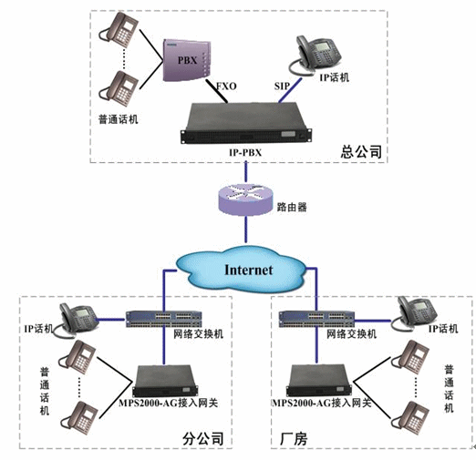各分公司根據(jù)實(shí)際分機(jī)數(shù)配置相應(yīng)的接入網(wǎng)關(guān)或IP話機(jī)。接入網(wǎng)關(guān)和IP話機(jī)通過Internet注冊到位于總公司的IP-PBX上,實(shí)現(xiàn)了總部電話和分公司、廠房電話之間的通信、號(hào)碼直撥、來電顯示等功能。