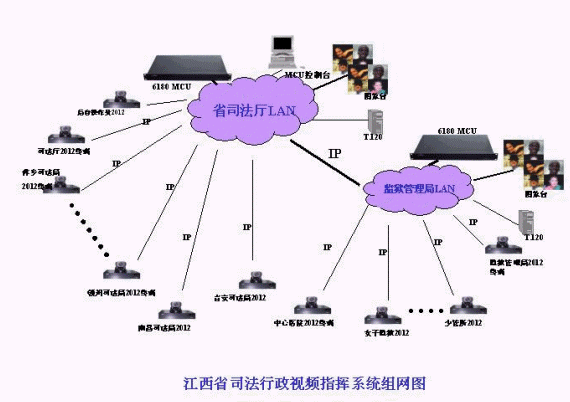 江西司法視頻會議系統(tǒng)的拓撲結構如圖所示。整個視頻會議系統(tǒng)為星型拓撲結構,其中二級網(wǎng)以省司法廳和省監(jiān)獄管理局為主會場,放置2個MCU;另外,包括11個地市司法局的分會場(南昌、九江、贛州、吉安、撫州、鷹潭、萍鄉(xiāng)、新余、上饒、景德鎮(zhèn)、宜春),14個監(jiān)獄和農(nóng)場分會場,傳輸網(wǎng)絡為2M IP網(wǎng)絡,視頻會議協(xié)議為H.323;司法局和監(jiān)獄管理局也可以單獨成網(wǎng),在分別依托省司法廳和省監(jiān)獄管理局MCU的情況下,各地市司法局或監(jiān)獄系統(tǒng)可與省司法廳或省監(jiān)獄管理局單獨進行雙向的視頻會議,整個系統(tǒng)具有很強的靈活性和擴展性。